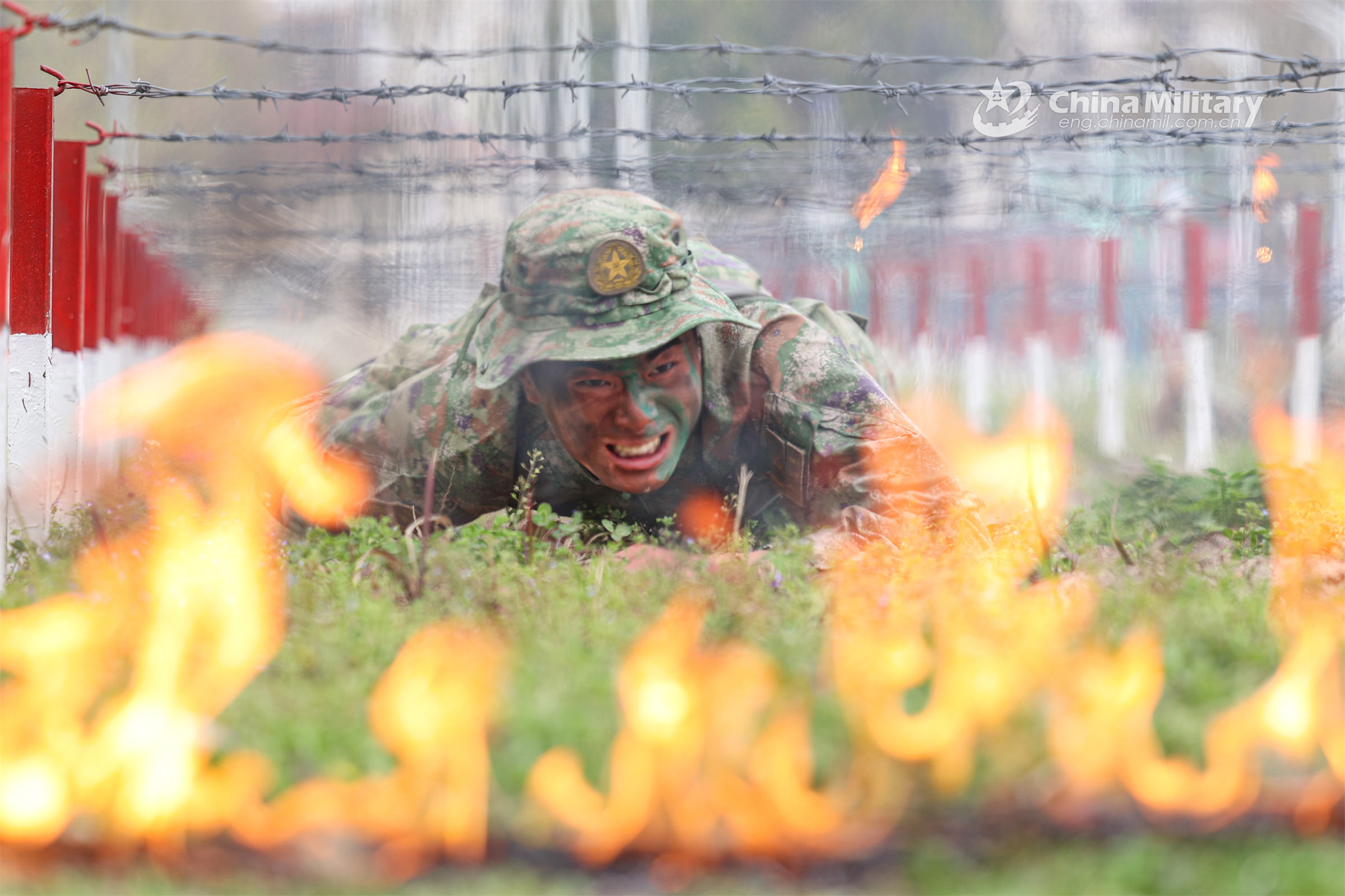 A special operations soldier assigned to a brigade under the PLA 72nd Group Army crawls forward under a wire obstacle on fire during an extreme fitness training exercise on March 29, 2023. (eng.chinamil.com.cn/Photo by Hu Xuefeng)