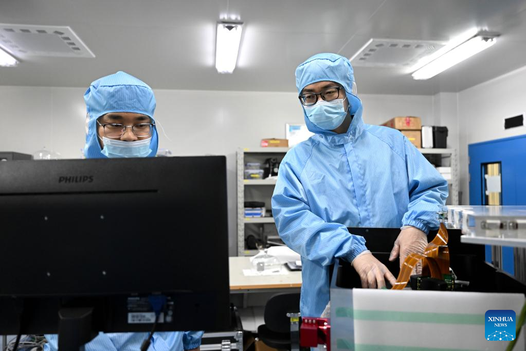 Zhou Haijin (R) and Zhulei, members of Anhui Institute of Optics and Fine Mechanics of Chinese Academy of Science (CAS), test equipment at Hefei Institutes of Physical Science of CAS in Hefei, capital of east China's Anhui Province, on April 18, 2023.?(Xinhua/Huang Bohan)