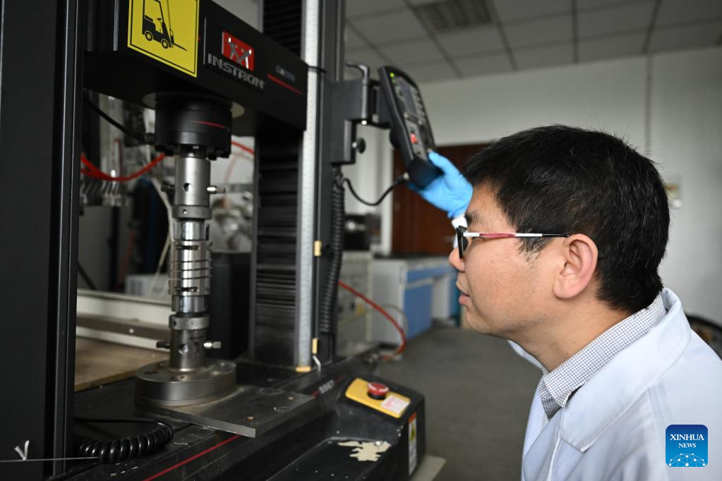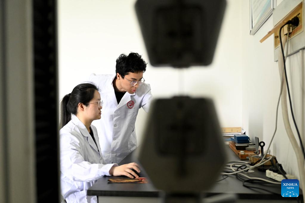 Students from a special aerospace metal materials research team of Institute of Solid State Physics of Chinese Academy of Science (CAS) test the tensile properties of a metal material at Hefei Institutes of Physical Science of CAS in Hefei, capital of east China's Anhui Province, on April 19, 2023. (Xinhua/Huang Bohan)
