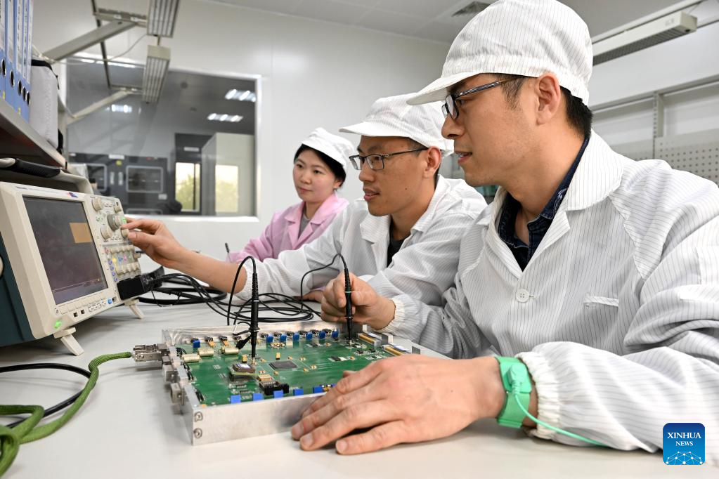 Lu Meina (R), Li Yang (C) and Nie Anran, members of Anhui Institute of Optics and Fine Mechanics of Chinese Academy of Science (CAS), work at a laboratory in Hefei Institutes of Physical Science of CAS in Hefei, capital of east China's Anhui Province, on April 18, 2023.?(Xinhua/Huang Bohan)