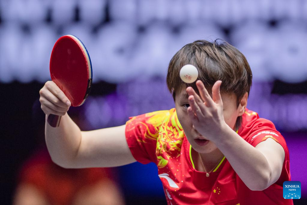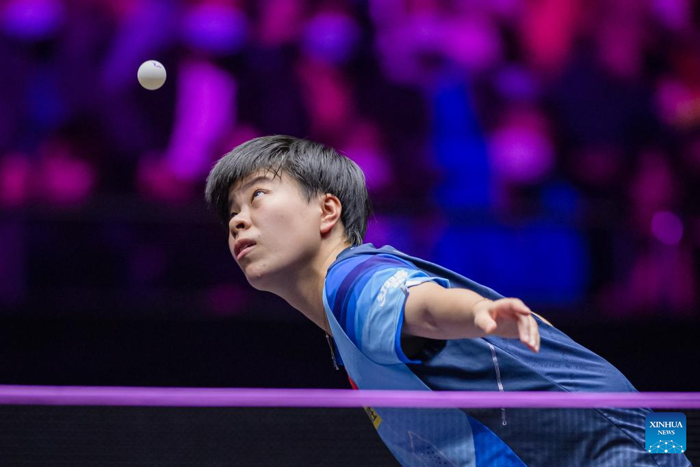 Wang Yidi of China hits a return during the women's singles semifinal match against her teammate Wang Manyu at the WTT Champions Macao 2023 in Macao, south China, April 22, 2023. (Xinhua/Cheong Kam Ka)