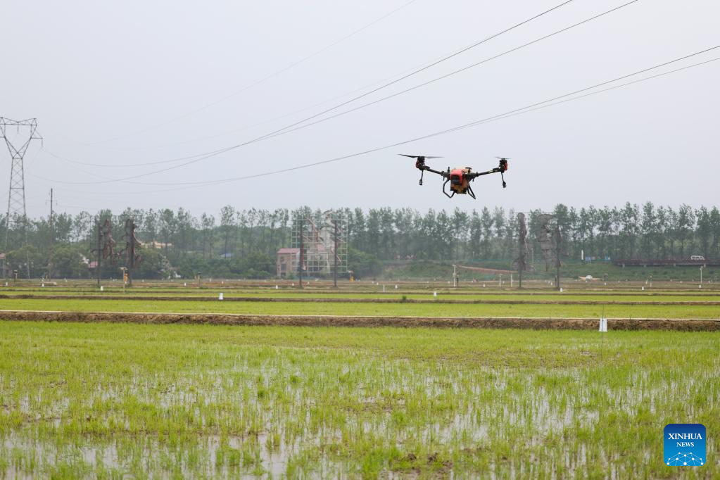 A drone sprays pesticide above a field in Zhongtang Village of Heshan District in Yiyang, central China's Hunan Province, on April 21, 2023. Agricultral machines such as rice transplanter, rotary tiller and drones have helped streamlining the spring ploughing here. (Xinhua/Xue Yuge)