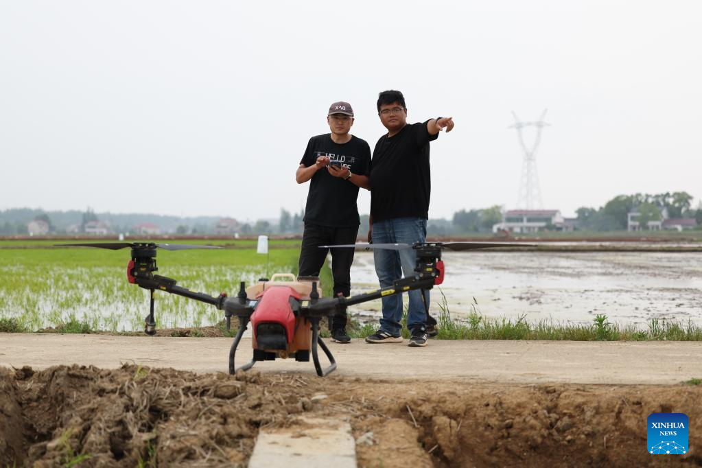 Staff members set a route for a drone to spray pesticide above a field in Zhongtang Village of Heshan District in Yiyang, central China's Hunan Province, on April 21, 2023. Agricultral machines such as rice transplanter, rotary tiller and drones have helped streamlining the spring ploughing here. (Xinhua/Xue Yuge)