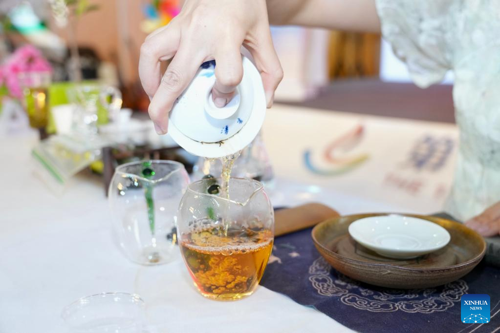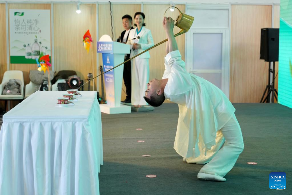 A tea artisan performs at Beijing International Tea and Tea Ceremony Exhibition in Beijing, capital of China, on April 21, 2023. The four-day event will last till April 24. (Xinhua/Cai Yang)