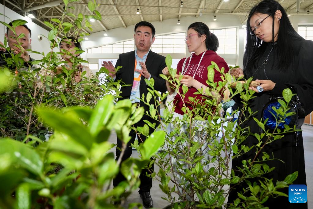 A staff member introduces different kind of tea to visitors at Beijing International Tea and Tea Ceremony Exhibition in Beijing, capital of China, on April 21, 2023. The four-day event will last till April 24. (Xinhua/Cai Yang)