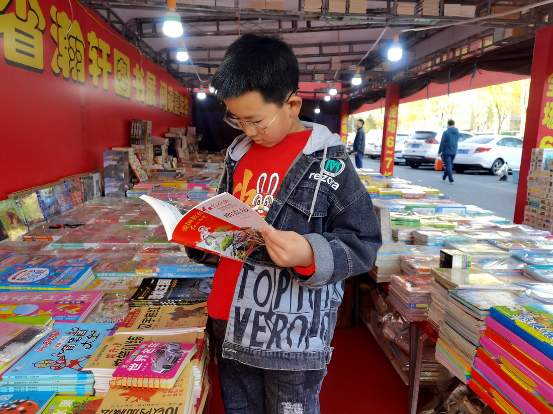 A boy reads at a booth displaying books in a shopping mall in Changchun, capital of northeast China's Jilin Province, April 19, 2023. (People's Daily Online/Wang Haiyue)