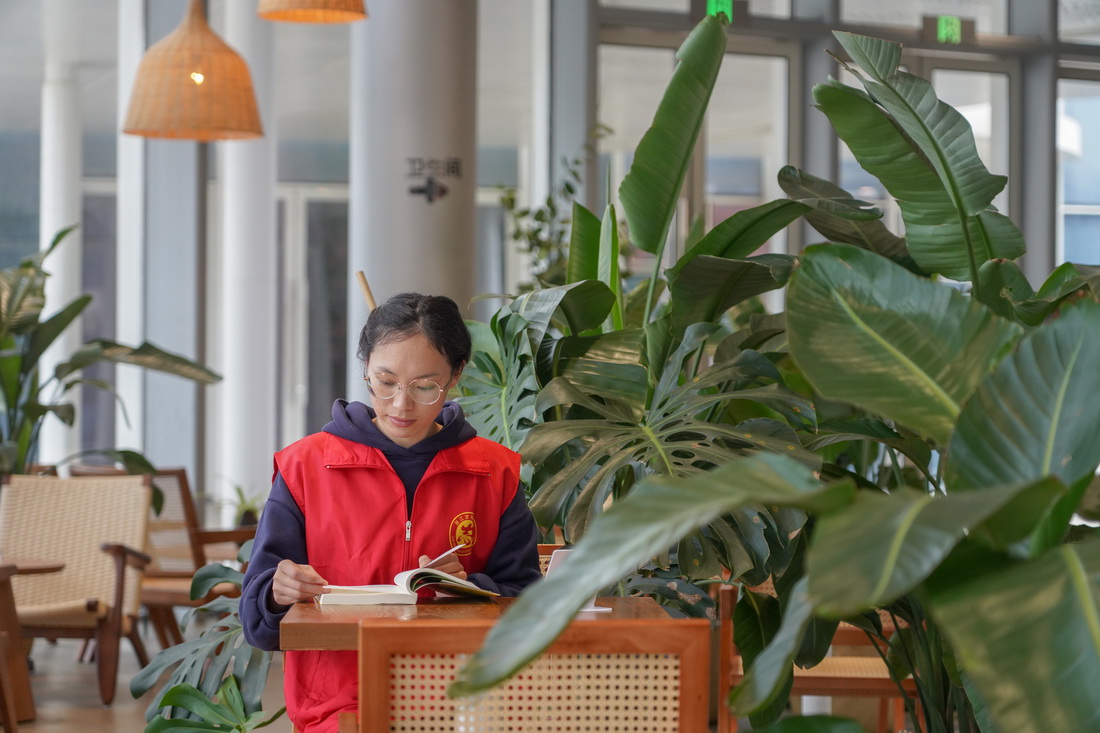 A volunteer reads during her spare time at a library in Caiyuan town, Shengsi county, Zhoushan city, east China's Zhejiang Province, April 19, 2023. (People's Daily Online/Zhang Yongtao)