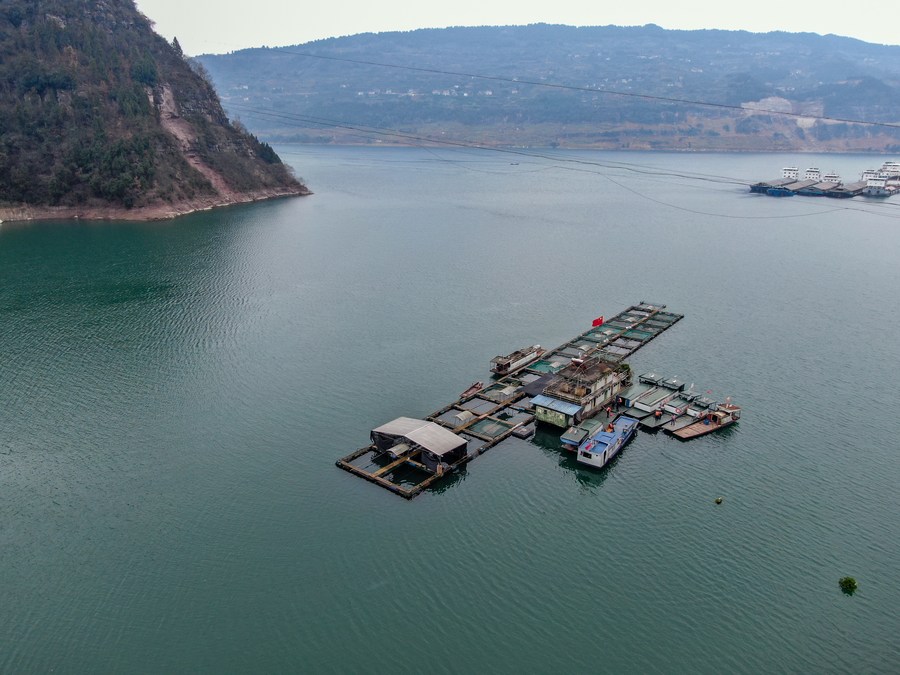 Aerial photo shows a breeding base for rare fishes in the Three Gorges Reservoir in southwest China's Chongqing, Feb. 25, 2022. (Xinhua/Tang Yi)