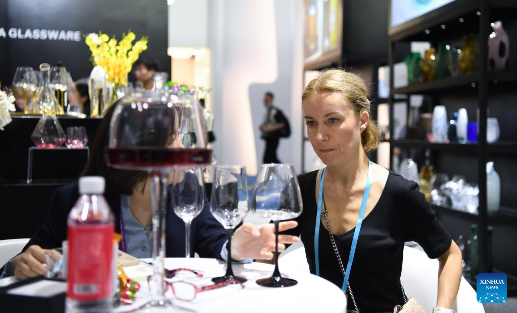 A visitor views glasses at the second phase of the 133rd session of the China Import and Export Fair, also known as the Canton Fair, in Guangzhou, south China's Guangdong Province, April 23, 2023. The second phase of the 133rd session of the Canton Fair kicked off Sunday with 18 exhibition sections and 24,000 booths, attracting approximately 12,000 enterprises. (Xinhua/Deng Hua)