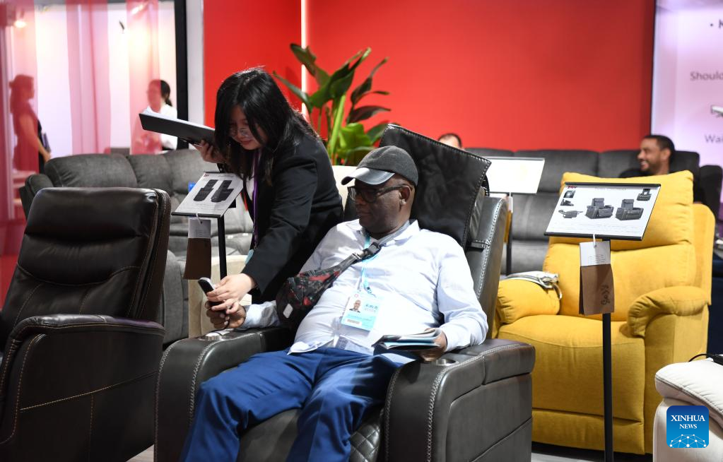 A visitor tries a massage chair at the second phase of the 133rd session of the China Import and Export Fair, also known as the Canton Fair, in Guangzhou, south China's Guangdong Province, April 23, 2023. The second phase of the 133rd session of the Canton Fair kicked off Sunday with 18 exhibition sections and 24,000 booths, attracting approximately 12,000 enterprises. (Xinhua/Deng Hua)