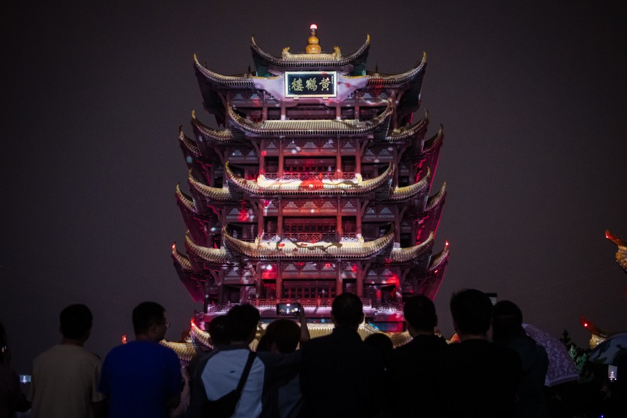 Tourists watch a light show at Huanghelou, or the Yellow Crane Tower, a landmark in Wuhan, central China's Hubei Province, April 21, 2023. (Xinhua/Wu Zhizun)