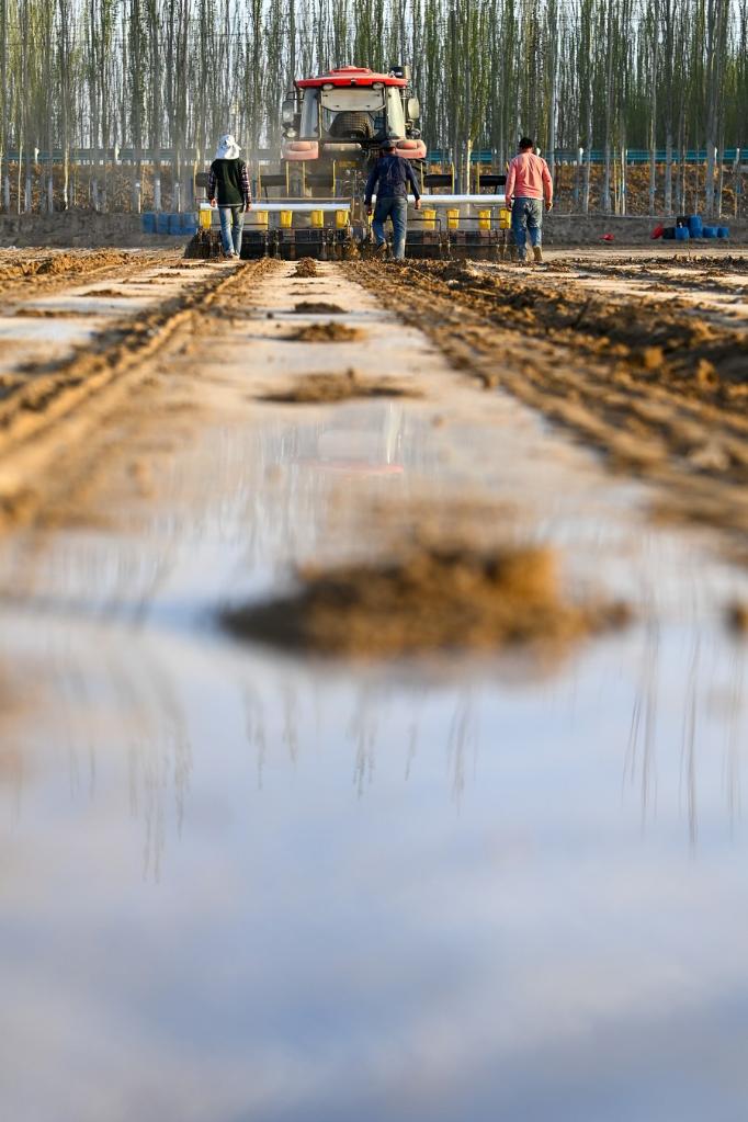 A precision seeding machine equipped with an autopilot system based on the BeiDou Navigation Satellite System is at work in a cotton field in Makit County, northwest China's Xinjiang Uygur Autonomous Region, April 2, 2023. (Xinhua/Ding Lei)