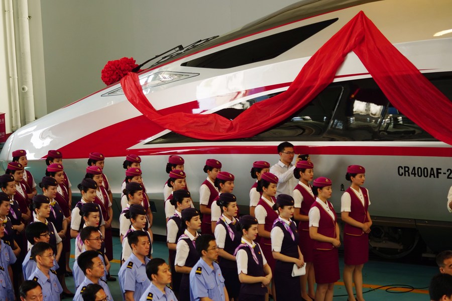 People attend a naming ceremony for the new models of China's electric multiple unit (EMU) train "Fuxing" in Beijing, capital of China, June 25, 2017. China holds complete intellectual property rights of "Fuxing" high speed trains.(Xinhua/Xing Guangli)