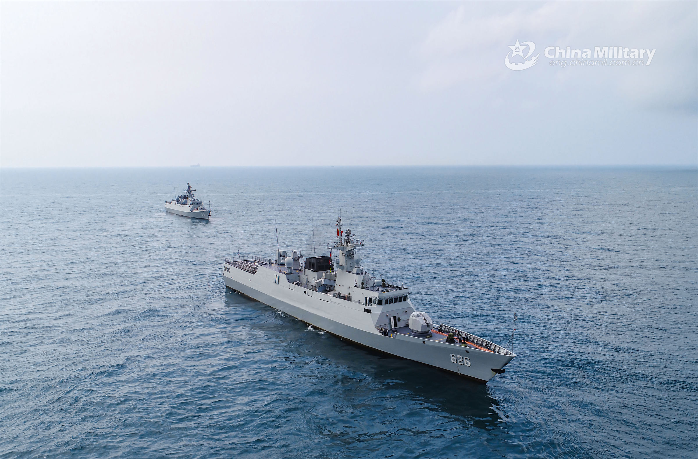 Guided-missile frigate Wuzhou (Hull 626) attached to a naval frigate flotilla under the PLA Southern Theater Command carries out a towing operation with another vessel during a real-combat training exercise on March 25, 2023. (eng.chinamil.com.cn/Photo by Zhang Bin)