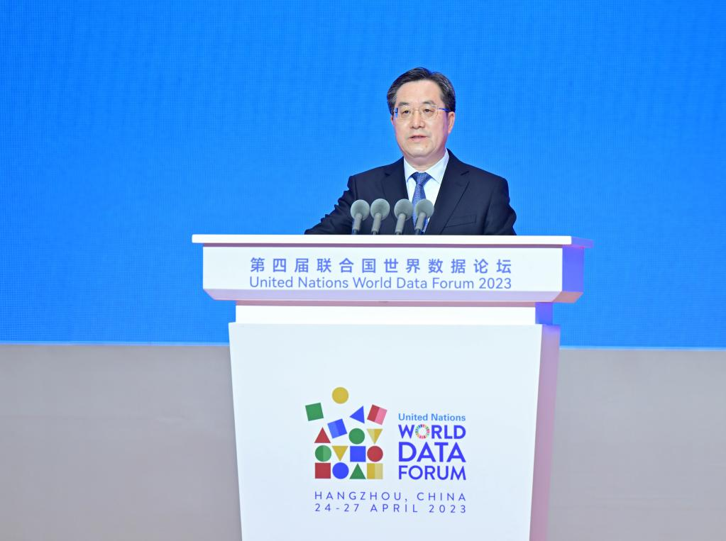 Chinese Vice Premier Ding Xuexiang, also a member of the Standing Committee of the Political Bureau of the Communist Party of China Central Committee, reads out a congratulatory letter sent by Chinese President Xi Jinping to the 4th United Nations World Data Forum and delivers a speech at the opening ceremony of the forum in Hangzhou, the capital of east China's Zhejiang Province, April 24, 2023. Prior to the opening ceremony, Ding met with guests attending the forum. (Xinhua/Yue Yuewei)