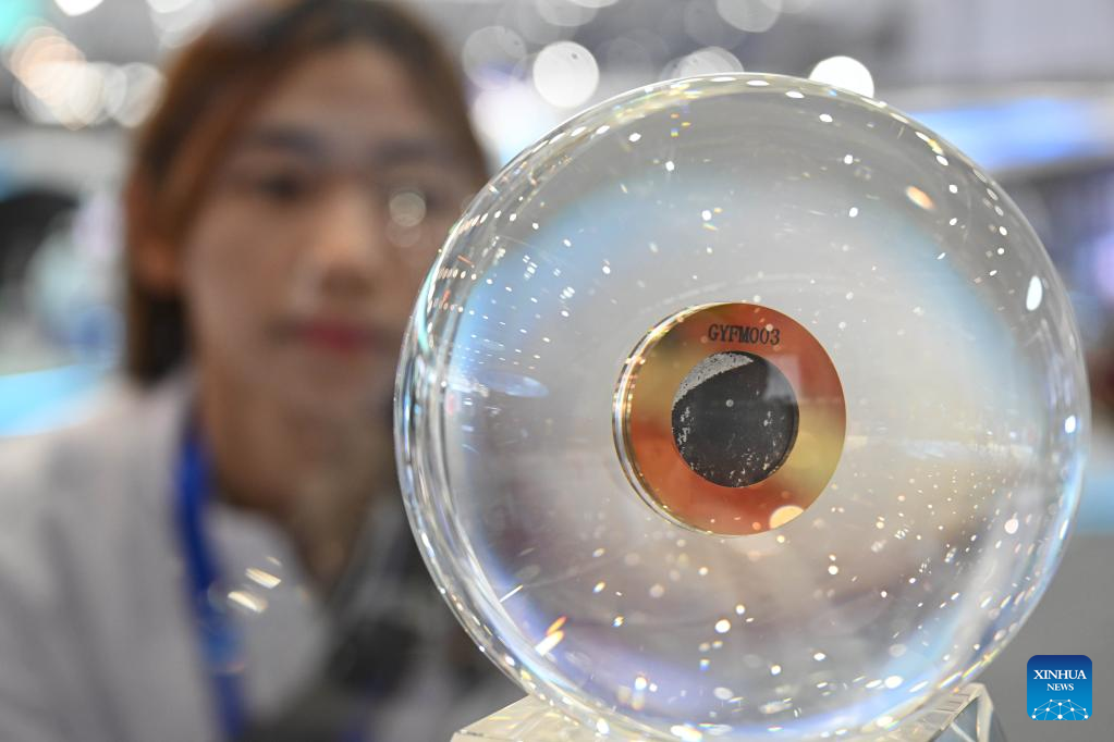 A visitor looks at a lunar soil sample displayed at a Space Day of China science exhibition in Hefei, east China's Anhui Province, April 24, 2023. (Xinhua/Huang Bohan)
