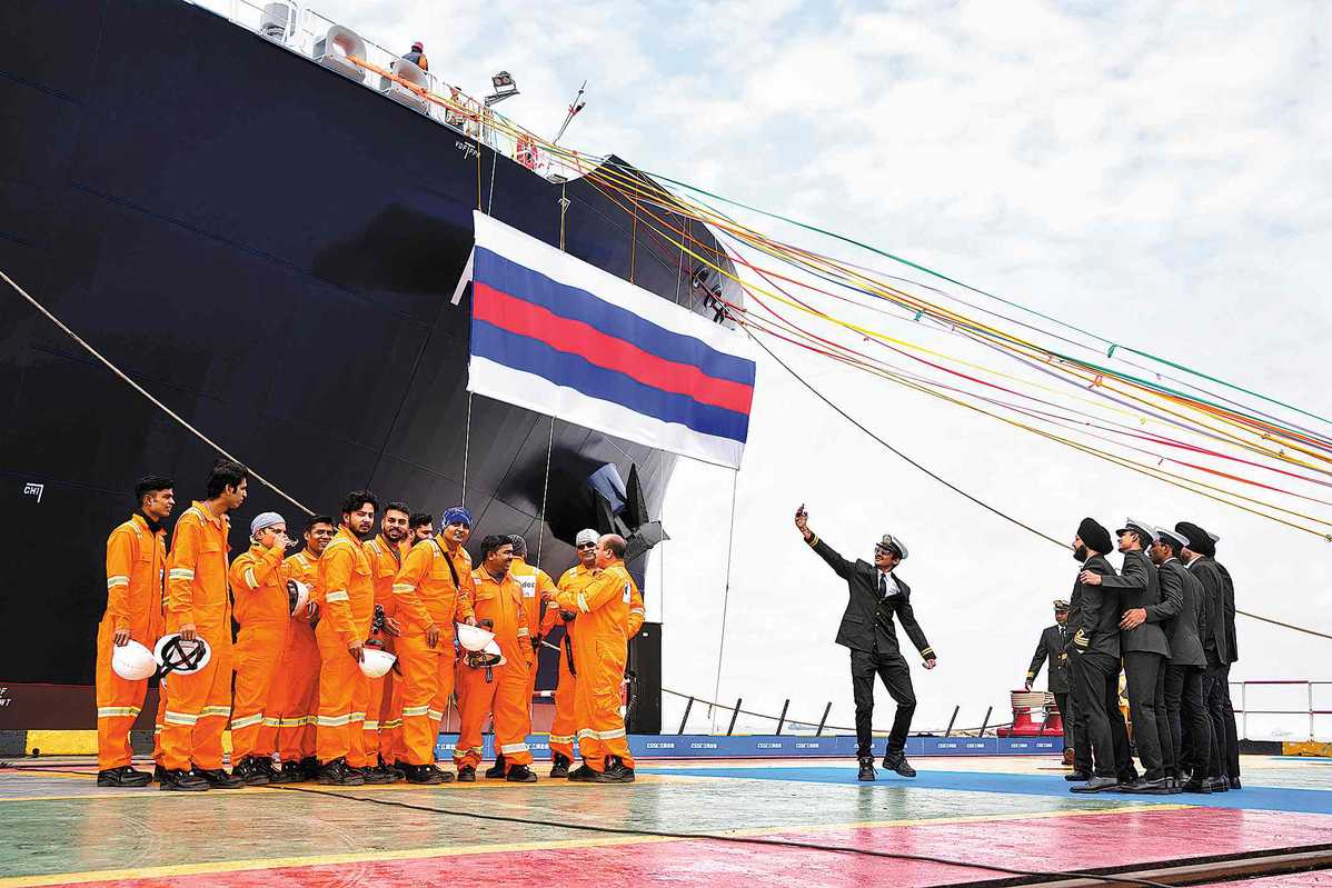 Crew members take pictures together before the unveiling of gas carrier Harzand at Jiangnan Shipyard in Shanghai on Tuesday. (CHINA DAILY/GAO ERQIANG)