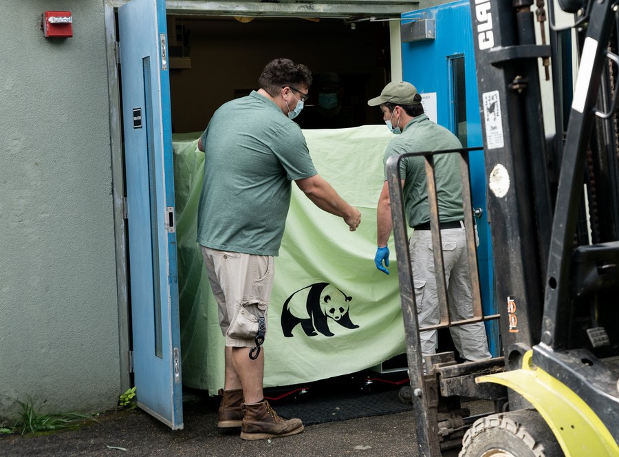 Staff members transfer a cage loaded with giant panda Ya Ya at the Memphis Zoo in Memphis, the United States, April 26, 2023. (Xinhua/Liu Jie)