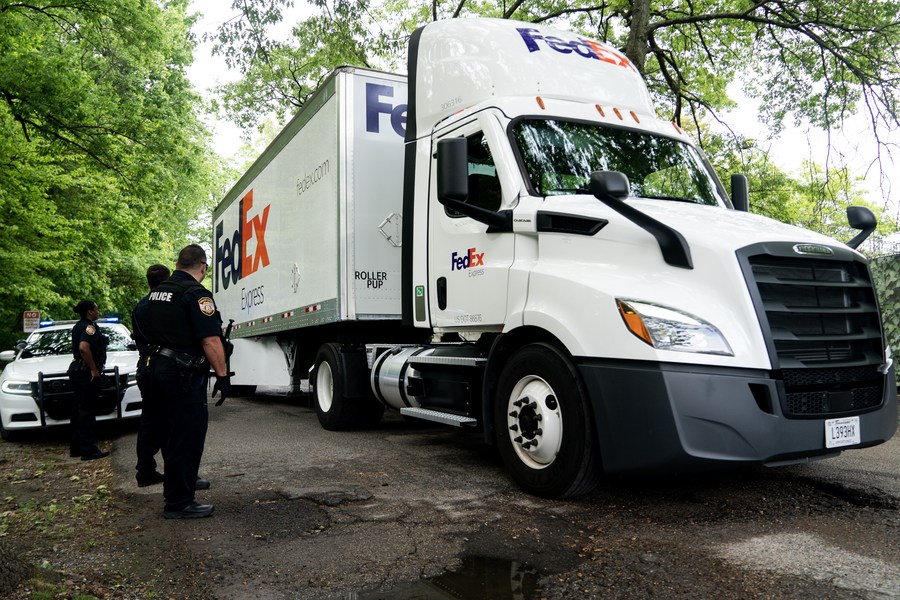 A vehicle transferring giant panda Ya Ya leaves the Memphis Zoo for the airport in Memphis, the United States, April 26, 2023. (Xinhua/Liu Jie)