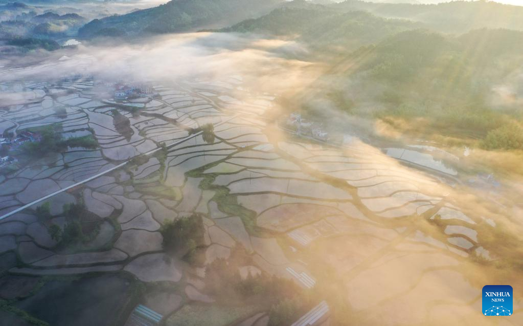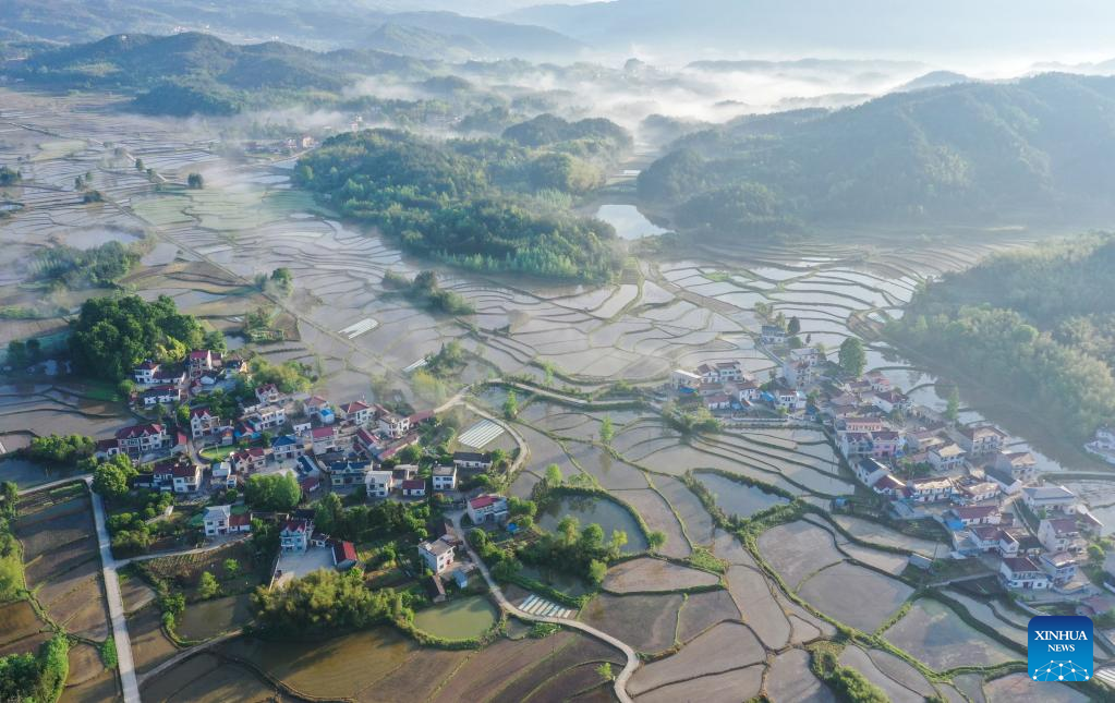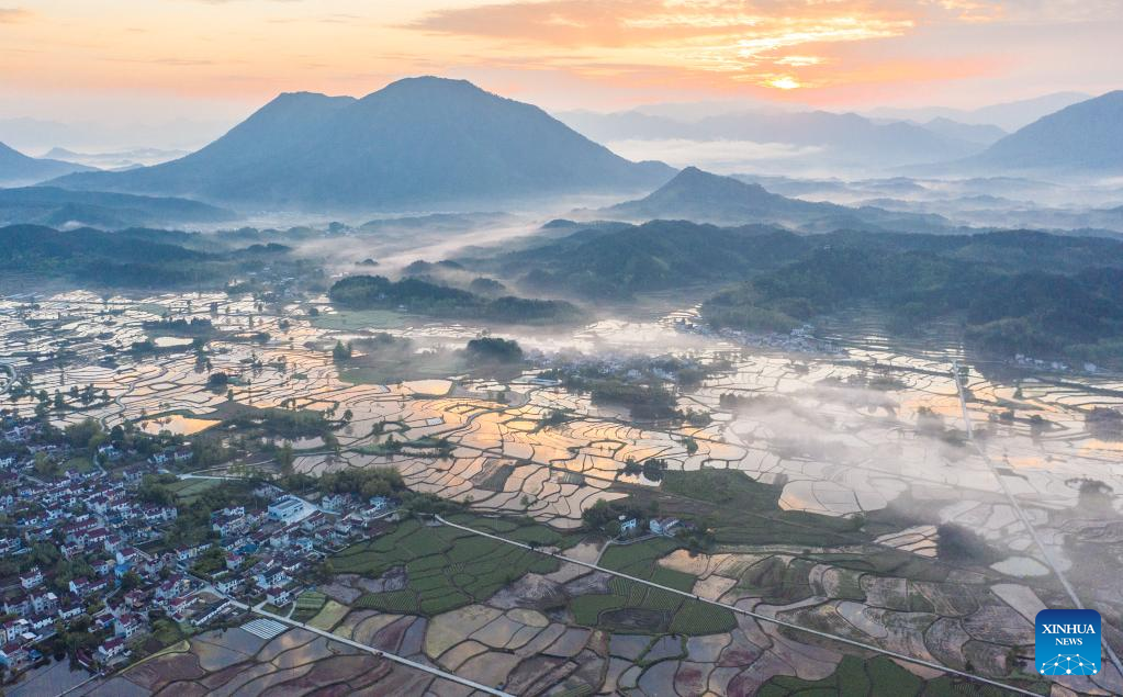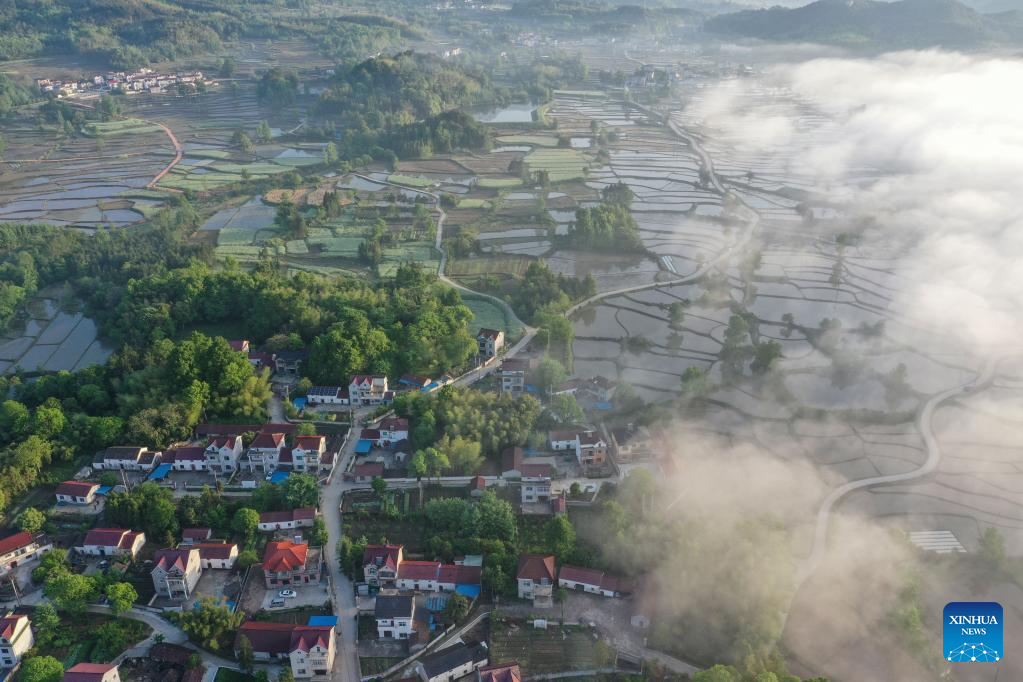 This aerial photo taken on April 27, 2023 shows a morning view of Sanshan Village in Jingde County of Xuancheng, east China's Anhui Province. (Photo by Jiang Jianxing/Xinhua)