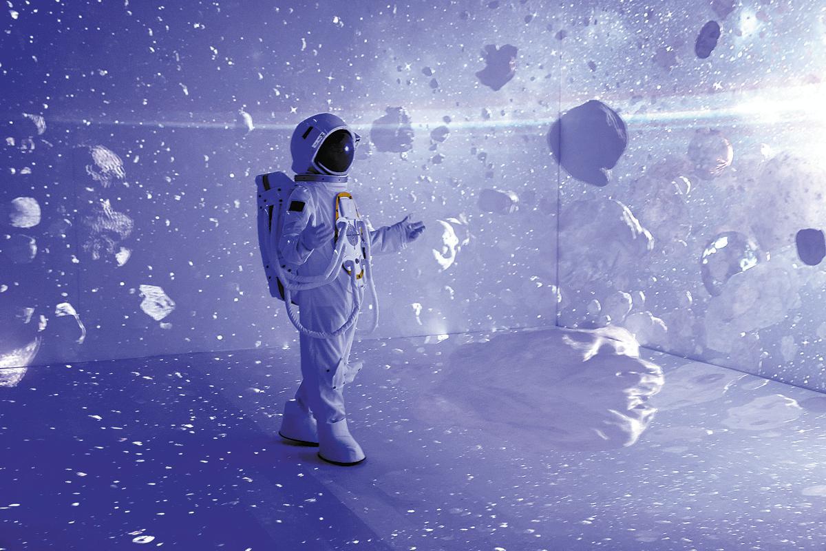 A person dressed as an astronaut experiences a virtual projection booth on Wednesday at the 6th Digital China Summit and Exhibition in Fuzhou, Fujian province. The five-day event opened the same day. Wang Wangwang / China News Service