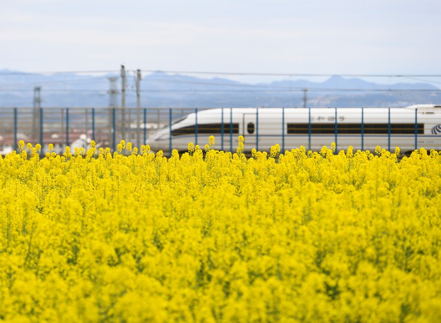 This photo taken on March 17, 2023 shows a high-speed train running past a cole flower field in Yangxian County of Hanzhong City, northwest China's Shaanxi Province. (Photo by Zou Jingyi/Xinhua)