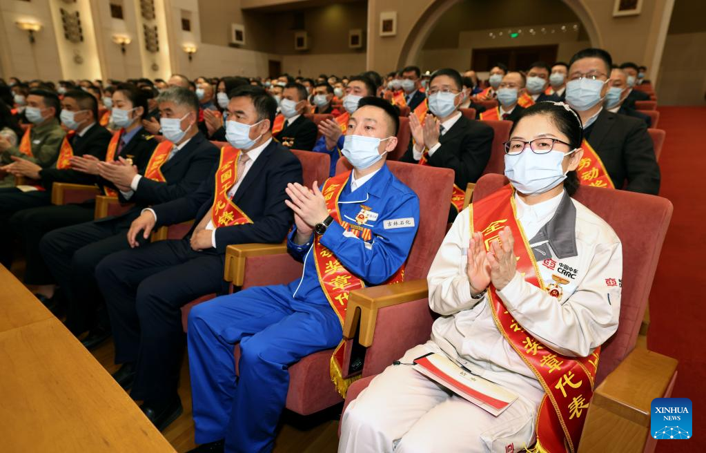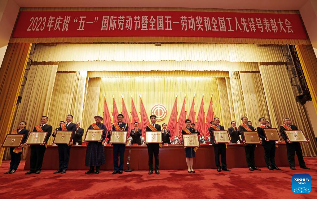 This photo taken on April 27, 2023 shows a meeting marking the upcoming International Labor Day in Beijing, capital of China, April 27, 2023. Exemplary units and workers were presented with national labor awards and honorary titles at the meeting. (Xinhua/Cai Yang)