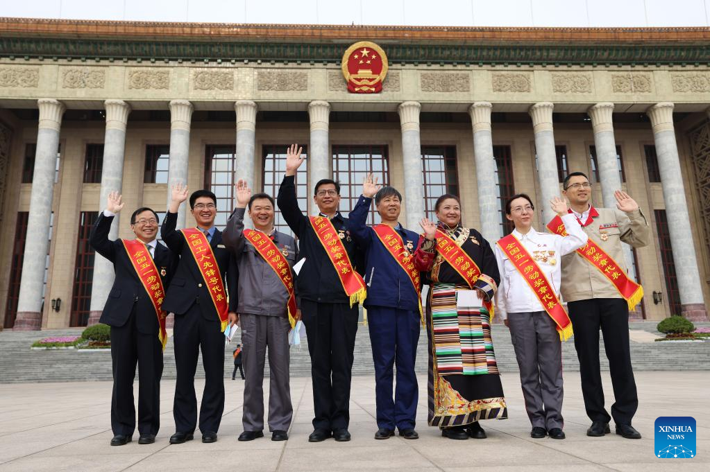 Attendees for a meeting marking the upcoming International Labor Day pose for a group photo in front of the Great Hall of the People in Beijing, capital of China, April 27, 2023. Exemplary units and workers were presented with national labor awards and honorary titles at the meeting. (Xinhua/Cai Yang)