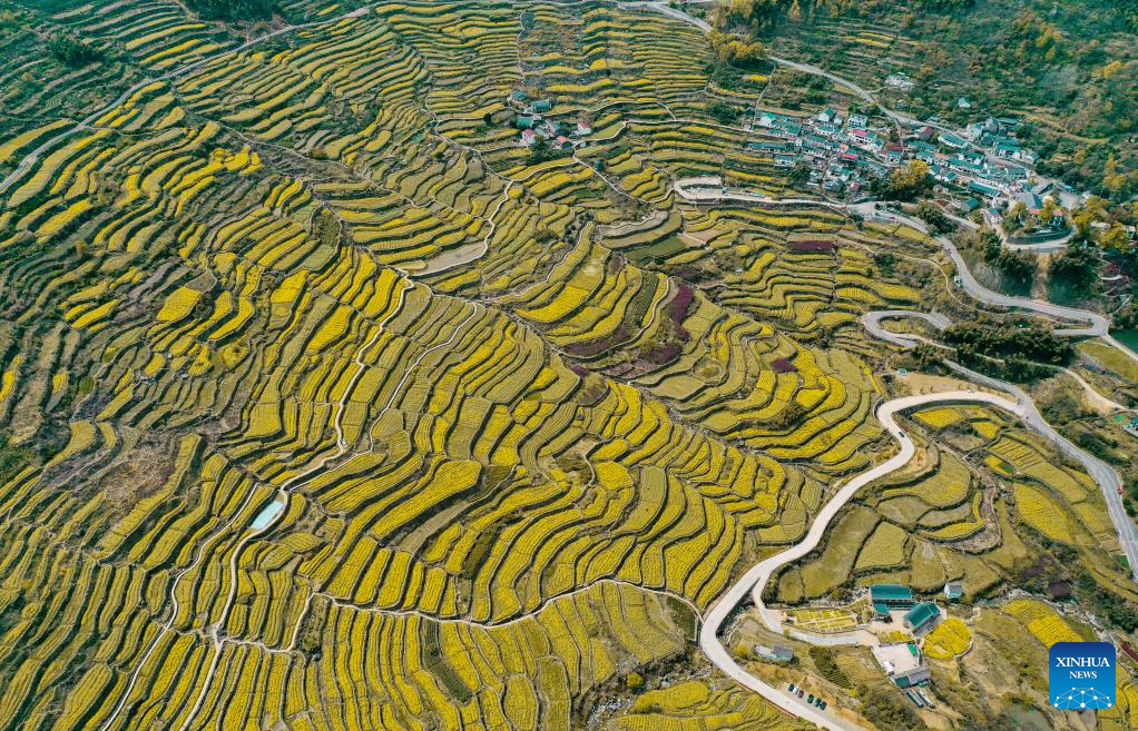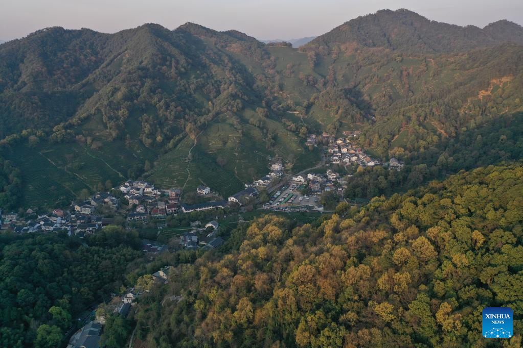 This aerial photo taken on Nov. 5, 2022 shows the autumn scenery of Zhinan Village in Lin'an District of Hangzhou City, east China's Zhejiang Province. China has inscribed a total of 8,155 traditional villages to its state protection list in an effort to conserve the country's millennia-old agricultural civilization, official data showed. Zhejiang is among the leaders in the country's rural vitalization drive, with great efforts being made to protect the natural environment and traditional culture. (Xinhua/Xu Yu)