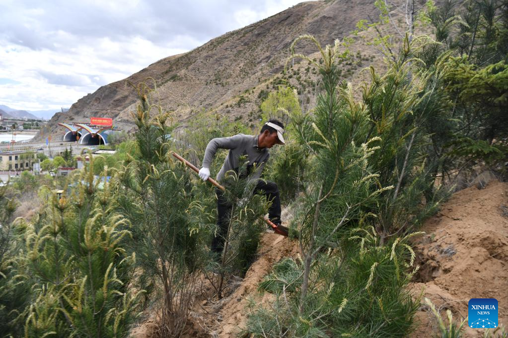 A man plants trees on a mountain in Lhasa, capital of southwest China's Tibet Autonomous Region, May 7, 2022. (Xinhua/Jigme Dorje)