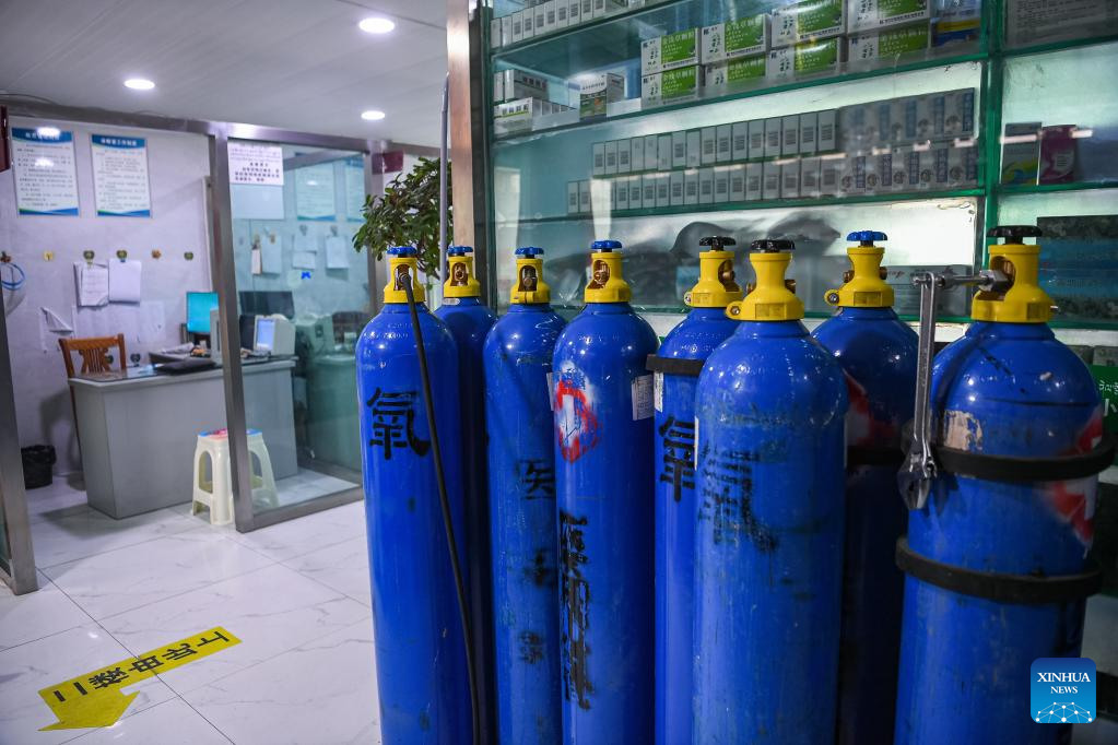 This photo taken on April 27, 2023 shows medical oxygen cylinders at a clinic in Lhasa, capital of southwest China's Tibet Autonomous Region. (Xinhua/Sun Fei)