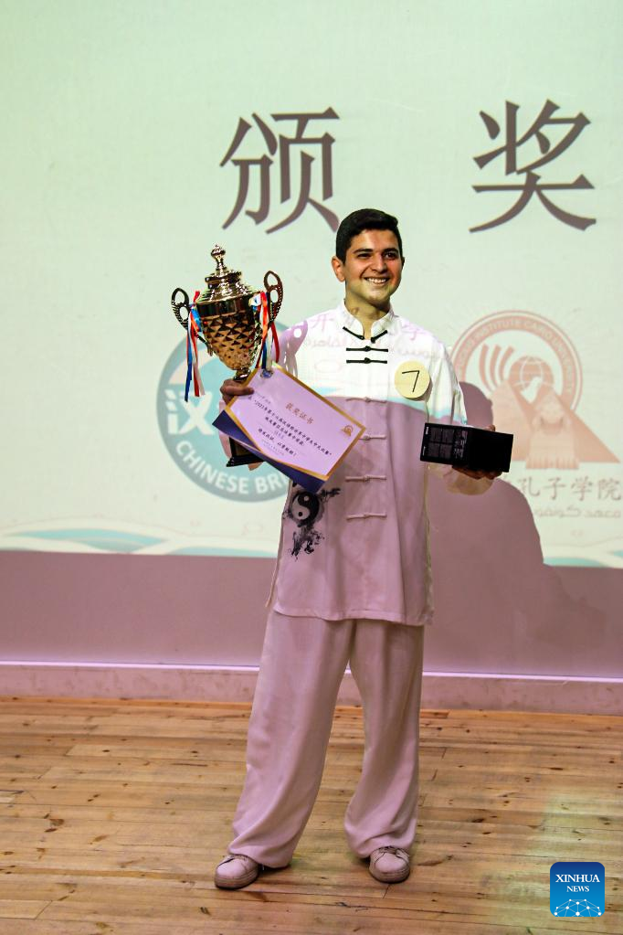 Egyptian student Mohamed Esmail poses with prizes for a photo during a Chinese Bridge language contest in Cairo, Egypt, on April 27, 2023. A qualifying round of an annual Chinese proficiency contest for foreign students concluded here in the Egyptian capital on Thursday. (Xinhua/Ahmed Gomaa)