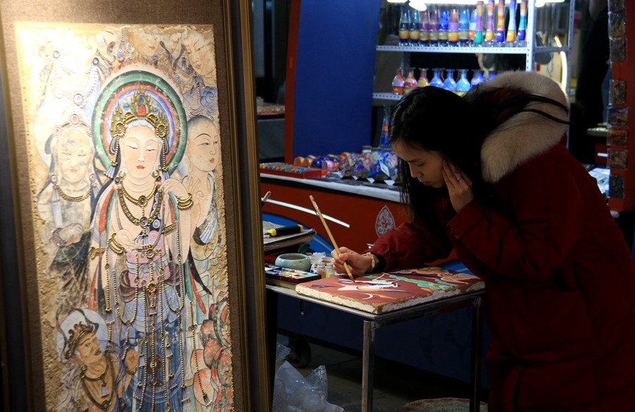 A craftswoman works on a clay painting at a night market in Dunhuang, northwest China's Gansu Province. (Photo/Zhang Xiaoliang)
