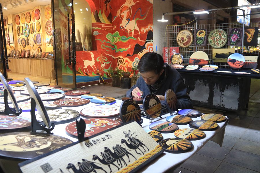 A craftsman works on a wood engraving painting at a night market in Dunhuang, northwest China's Gansu Province. (Photo/Zhang Xiaoliang)