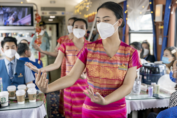 Railway staff perform Laos dance for passengers on a tourist train on China-Laos Railway, June 23, 2022. (Xinhua/Chen Chang)