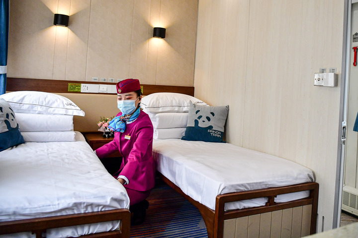A train stewardess arranges bedding on the "panda train" in southwest China's Sichuan Province, March 24, 2021. (Xinhua/Zhang Chaoqun)