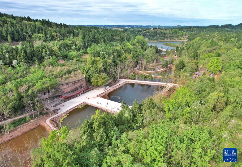 This aerial photo taken on April 3, 2023 shows the Wofo Yard in Anyue County, southwest China's Sichuan Province. Wu Zhongfu, 73-year-old, has been protecting and conserving the Buddhist statues and stone carvings of Buddhist scriptures from Tang Dynasty (618-907) for 41 years in the Wofo (meaning sleeping Buddha) Yard of Anyue County in Sichuan Province.