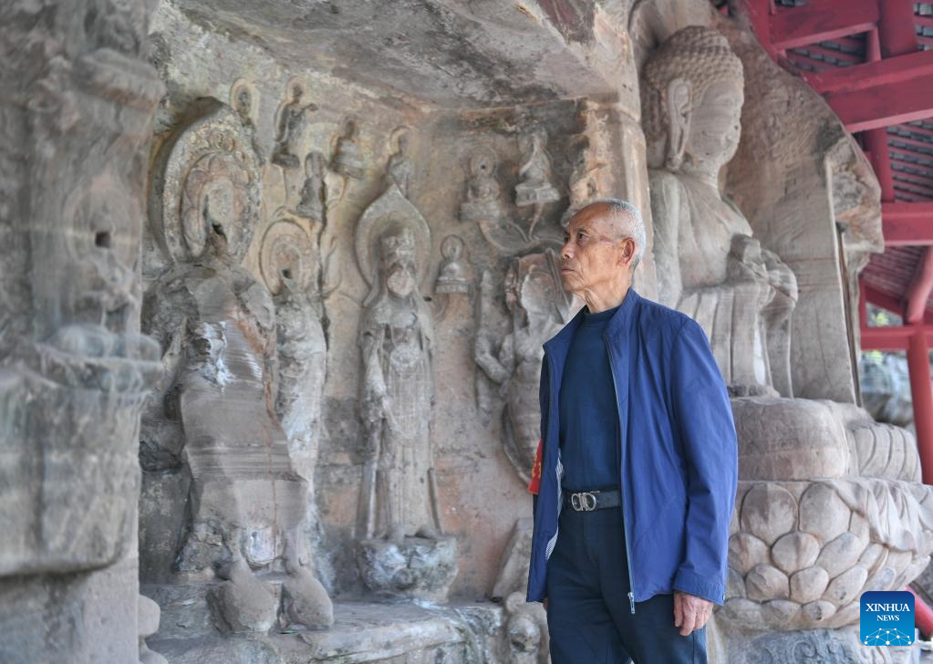 Wu Zhongfu patrols the Wofo Yard in Anyue County, southwest China's Sichuan Province, April 3, 2023. Wu Zhongfu, 73-year-old, has been protecting and conserving the Buddhist statues and stone carvings of Buddhist scriptures from Tang Dynasty (618-907) for 41 years in the Wofo (meaning sleeping Buddha) Yard of Anyue County in Sichuan Province.