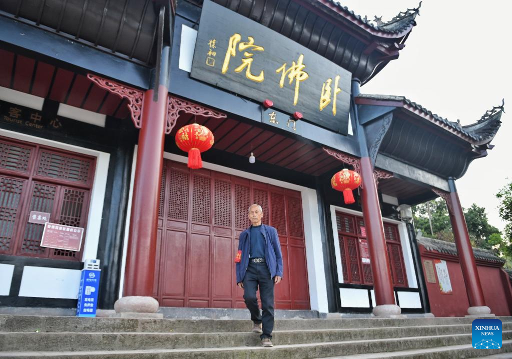 Wu Zhongfu leaves the Wofo Yard after work in Anyue County, southwest China's Sichuan Province, April 3, 2023. Wu Zhongfu, 73-year-old, has been protecting and conserving the Buddhist statues and stone carvings of Buddhist scriptures from Tang Dynasty (618-907) for 41 years in the Wofo (meaning sleeping Buddha) Yard of Anyue County in Sichuan Province.