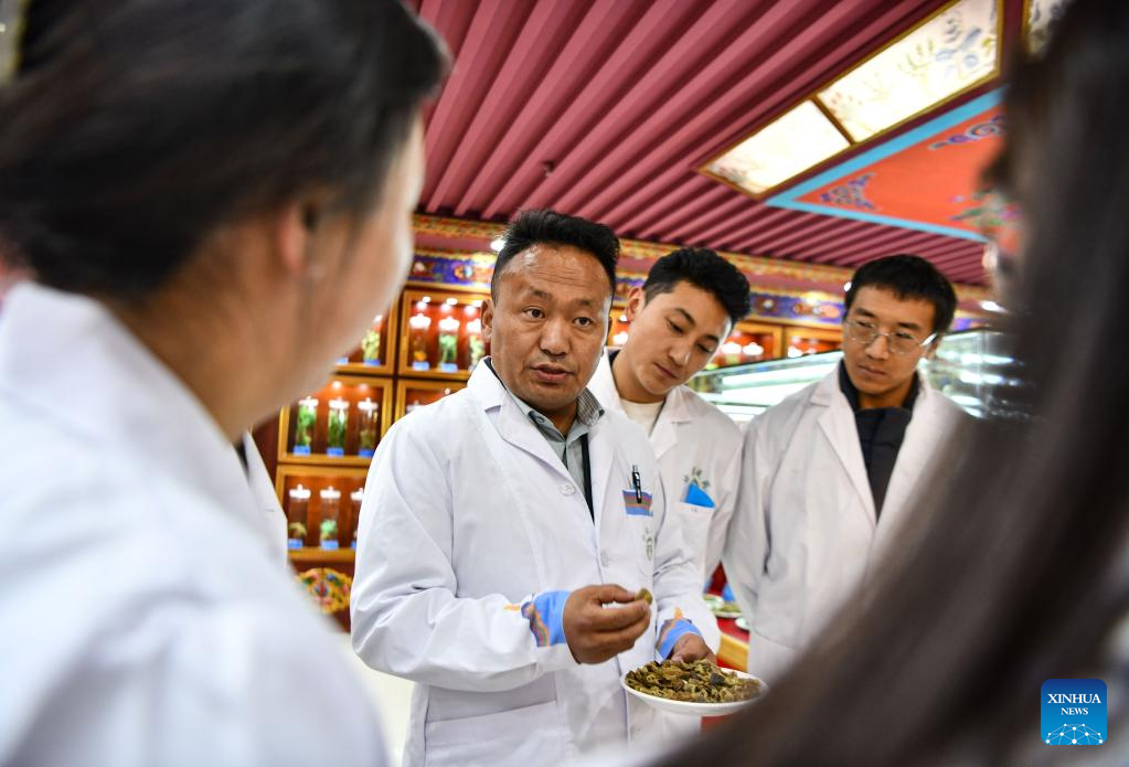 Buchung Tsering gives a lesson to his students in a specimen gallery for Tibetan medicine in Tibet Ganlu Tibetan Medicine Co., Ltd. in Lhasa, southwest China's Tibet Autonomous Region, April 20, 2023.