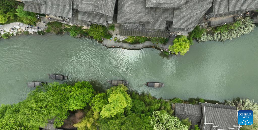 This aerial photo taken on May 2, 2023 shows tourists visiting an ancient village on boats in Zunyi City, southwest China's Guizhou Province. China is witnessing a travel boom during this year's five-day May Day holiday. (Photo by Yuan Fuhong/Xinhua)
