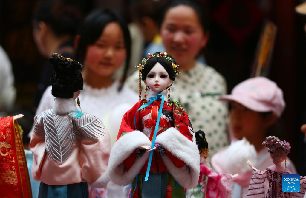 Dolls are seen on a fair in Tengzhou City, east China's Shandong Province, May 2, 2023. China is witnessing a travel boom during this year's five-day May Day holiday. (Photo by Li Zhijun/Xinhua)