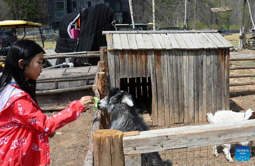 A tourist feeds sheep at a hot spring resort in Longhua County, north China's Hebei Province, May 2, 2023. China is witnessing a travel boom during this year's five-day May Day holiday. (Xinhua/Jin Liangkuai)