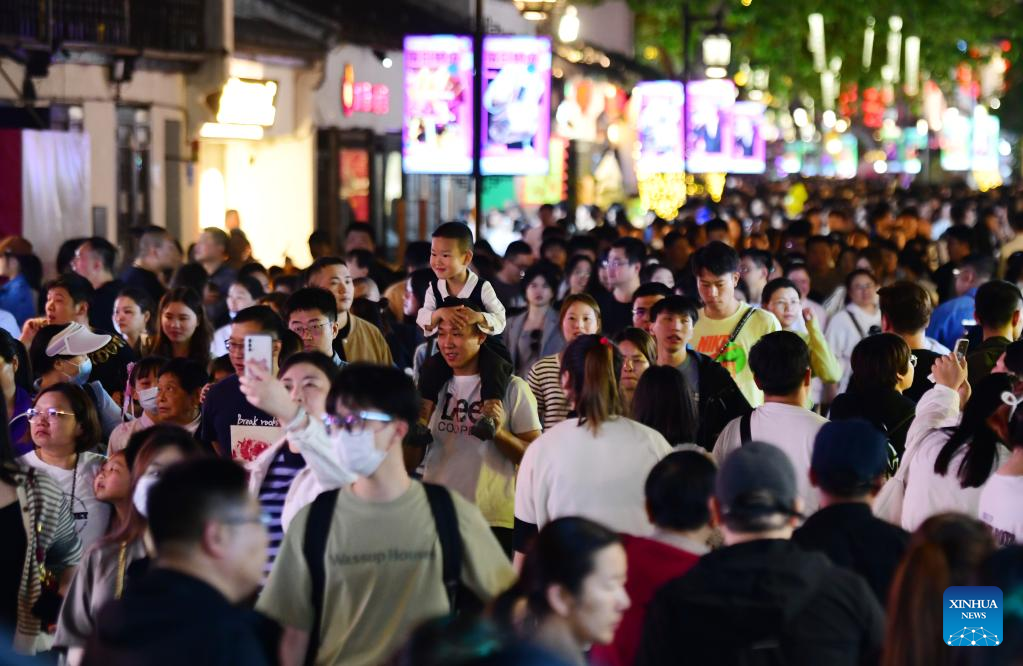 Tourists visit the Qingming Bridge historical community in Wuxi, east China's Jiangsu Province, May 1, 2023. China is witnessing a travel boom during this year's five-day May Day holiday. (Photo by Huan Yueliang/Xinhua)