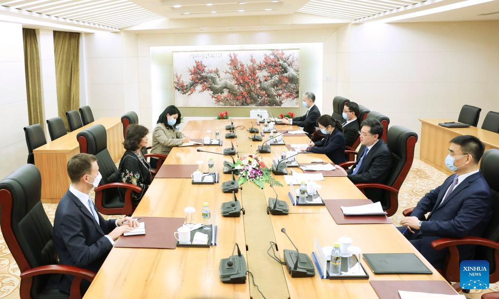 BEIJING, May 1 (Xinhua) -- Chinese State Councilor and Foreign Minister Qin Gang met with Noeleen Heyzer, special envoy of the secretary-general of the United Nations (UN) for Myanmar, in Beijing on Monday.