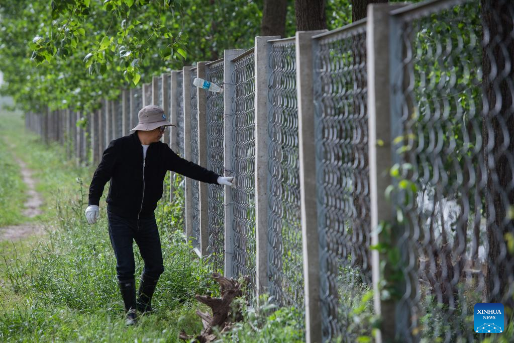 Ranger Wang Chuanjun reinforces wire netting at Shishou Milu Deer National Nature Reserve in central China's Hubei Province, April 29, 2023. (Xinhua/Wu Zhizun)