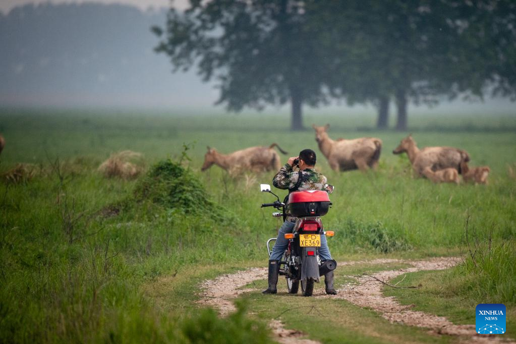 Ranger Wang Chuanjun patrols at Shishou Milu Deer National Nature Reserve in central China's Hubei Province, April 29, 2023. (Xinhua/Wu Zhizun)