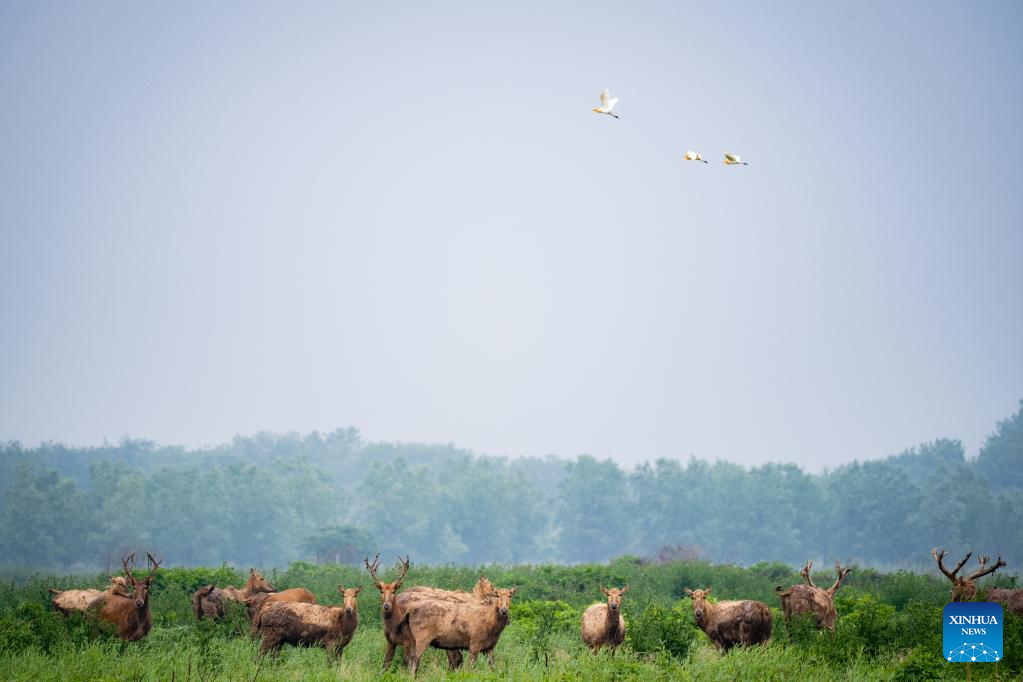 This photo taken on April 28, 2023 shows milu deer and birds at Shishou Milu Deer National Nature Reserve in central China's Hubei Province. (Xinhua/Wu Zhizun)