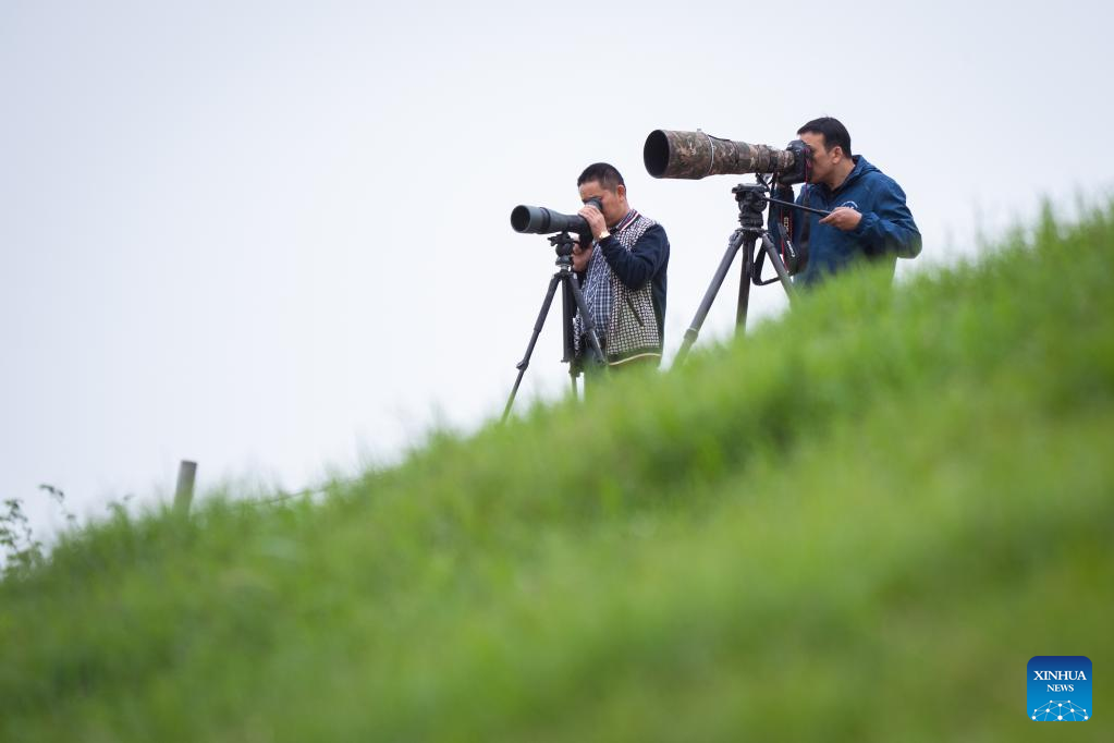 Staff member Zhang Yuming observes milu deer with a telescope at Shishou Milu Deer National Nature Reserve in central China's Hubei Province, April 29, 2023. (Xinhua/Wu Zhizun)