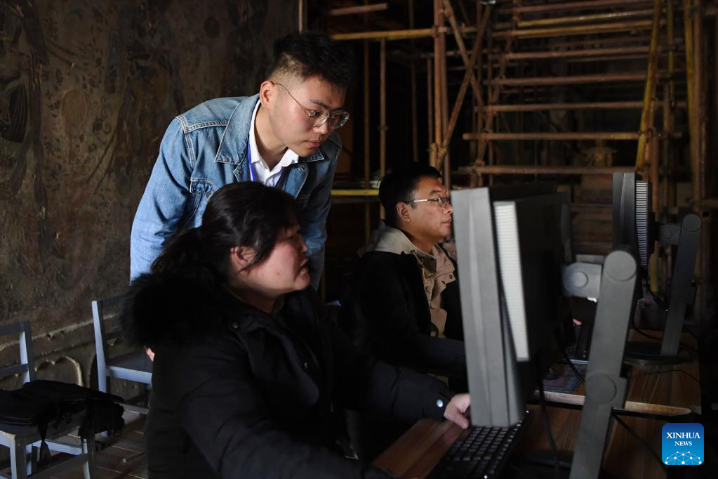 Xiong Yeteng (C), a technician from the Dunhuang Academy's digital preservation team, and his colleagues look at the newly collected pictures in a cave of the Mogao Grottoes in Dunhuang, northwest China's Gansu Province, April 25, 2023. A group of young technicians have sought to use digital technology to ensure the permanent preservation and sustainable use of cultural relics in the Mogao Grottoes, a UNESCO World Heritage site in Dunhuang. (Xinhua/Chen Bin)
